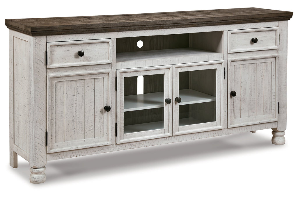 Have your fill of modern farmhouse style with this TV stand. Its distressed two-tone finish pairs a vintage white with a weathered gray for a look that’s utterly charming. Right and left cabinets open to reveal adjustable shelving for all your entertainment center storage needs. Center glass doors add to its relaxed appeal.