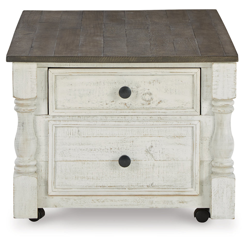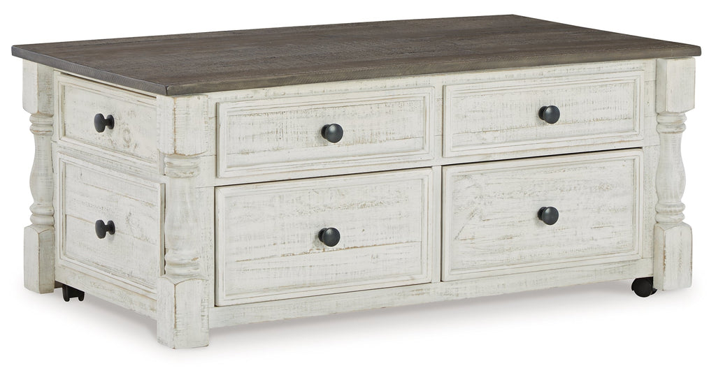 What a fresh interpretation of country classic style. Inspired by American farmhouse craftsmanship, but with an elevated sensibility, this lift-top coffee table blends distinctive details such as turned post accents and raised drawer fronts for a substantial look that feels right at home. Those who appreciate rustic character should take note of the table’s thick crown moulding, beautified with a vintage two-tone finish. It features four storage drawers, a small concealed storage tray under the lift-top, and robust legs that are ready to stand the test of time.