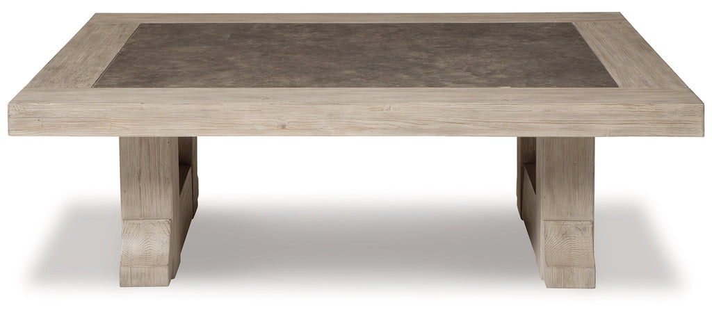 A striking example of rustic refinement, this coffee table is generously scaled to accommodate your entertainment needs with ease. Made with pine wood and veneer beautified with a complex bisque finish, this designer coffee table includes a top with melamine inset for mixed-media interest.