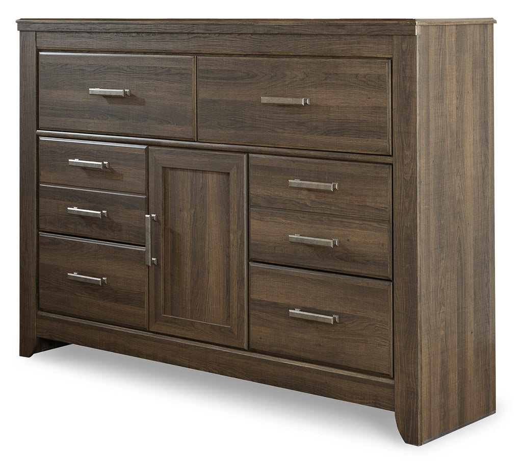 Get the look of posh barn wood without setting foot in a salvage yard. Replicated rough-sawn oak of this dresser has a vintage finish that is reminiscent of a timeworn family heirloom. Warm, rustic and naturally beautiful, it’s just got that ageless appeal. Sleek, mod pulls in a pewter tone are a snappy finishing touch.
