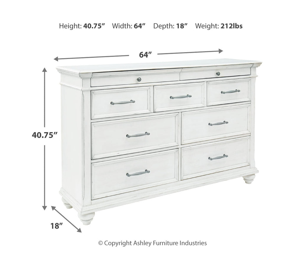 Give your retreat vintage charm and valuable drawer storage with this dresser. In a beautifully distressed whitewash finish, you'll love putting it all away in casual style. Seven full-sized drawers and two accessory top drawers will easily accommodate your needs. Generously scaled moulding from top to bottom, along with bun feet and drawer handles with a transitional aesthetic, give this dresser character—evoking the feel of a quaint cottage escape.
