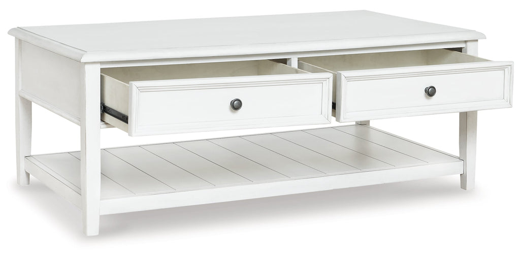 Give your home vintage charm and valuable storage with this stunning coffee table. In a beautifully distressed whitewashed finish, two drawers and a roomy display shelf will help you keep chairside essentials nearby in casual style. Simple farmhouse design evokes the feel of a quaint cottage escape.