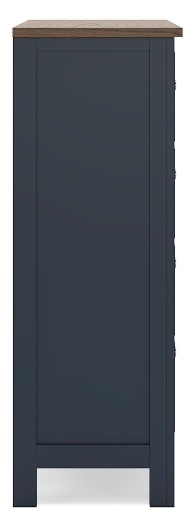 Add homespun charm to your restful retreat. A modern take on a timeless silhouette, this chest of drawers pairs a dark slate blue finish with a light brown top. Drawer fronts and legs in a classic Shaker style bring an air of beautiful simplicity to the bedroom. Whether it's part of a charmingly curated guest suite or a casually carefree kids room, this chest is a welcome addition.