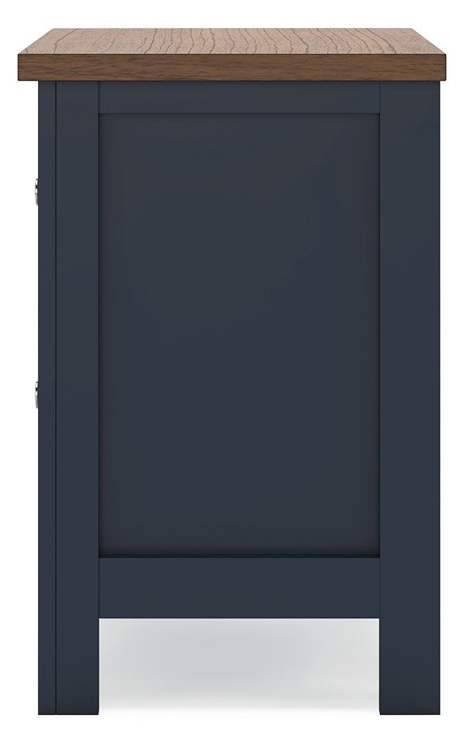 Add homespun charm to your restful retreat. A modern take on a timeless silhouette, this nightstand pairs a dark slate blue finish with a light brown top. Drawer fronts and legs in a classic Shaker style bring an air of beautiful simplicity to the bedroom. Whether it's part of a charmingly curated guest suite or a casually carefree kids room, this nightstand is a welcome addition.