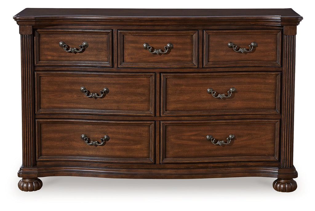 Take inspiration from the traditional luxury of this dresser. Classic with a rich cherry brown finish, its stately presence graces your room with an air of opulence. Your taste for exquisite details is satisfied with decorative drawer pulls and chic bun feet. With seven drawers acting as elegant hosts for clothes and other essentials, your restful retreat has never been so refined.