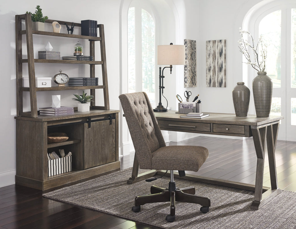 Work the latest trend in casual farmhouse living with this home office desk. Elements include distinctive cross brace with stretcher styling and a wire brushed gray-brown finish that’s so easy on the eyes. Making this home office desk all the more unique: a faux bluestone inset on the desk top for a mixed media twist. Three smooth-gliding drawers with brushed nickel-tone pulls help keep you organized and on task.