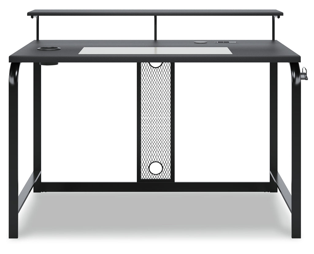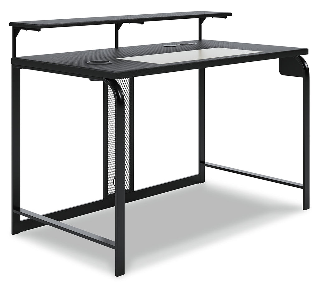 Ultra mod. Work smarter—and look cool doing it—with the new-age efficiency of this desk. Its streamlined design is accented with a tech-inspired decorative laminate surface and PVC insert for mouse tracking. This super sleek yet fully loaded home office desk includes a raised monitor stand with LED ambient lighting, a headset hanger conveniently mounted on the side and a mesh modesty panel underneath for managing all your cords. And with an integrated cup holder, wireless Qi charger and 110V power supply with dual USB ports for charging all your devices, this desk really is designed to keep you up and running.