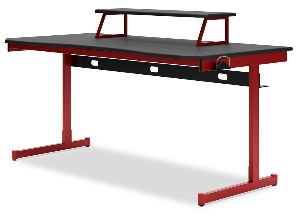 Work smarter (and look cool doing it) with the new-age efficiency of this home office desk. Its streamlined design is ideal for gaming or as a general workstation. The super-sleek yet fully-loaded home office desk has a tech-inspired surface and raised monitor stand for ultimate style and efficiency. Its fantastic features also include a headset hanger conveniently mounted on the side, as well as a raceway tucked underneath for managing all your cords.