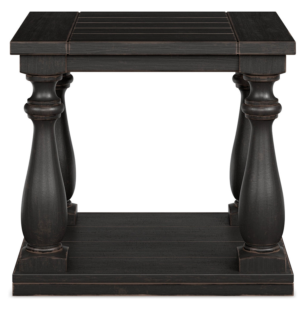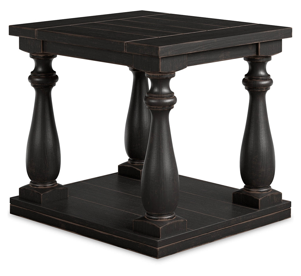 This black end table has a dramatic presence—exactly what an eclectically styled room needs. Solid wood planks and thick veneer merge seamlessly together for a hearty helping of style. Handsomely turned legs connect to a lower shelf flush with the floor. A rustic wirebrush technique gives this stunning square end table in black with show-through contrasting just enough of a weathered sensibility.