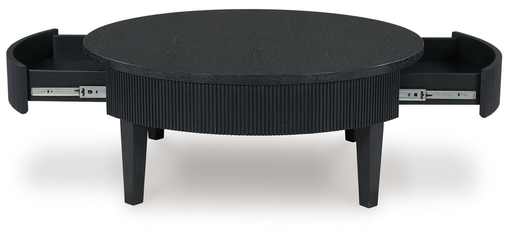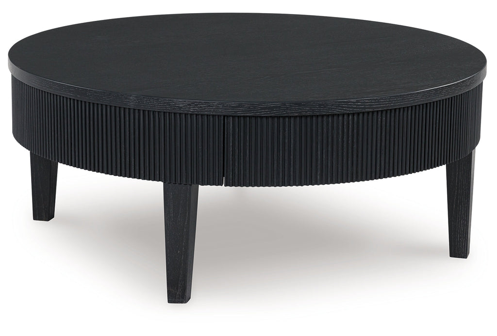 Classic and cool in dark charcoal, this coffee table brings contemporary convenience to your living room. Short on storage? The trendy reeded apron conceals a drawer perfect for remotes, controllers and other entertainment accessories. What a perfect marriage of style and functionality.