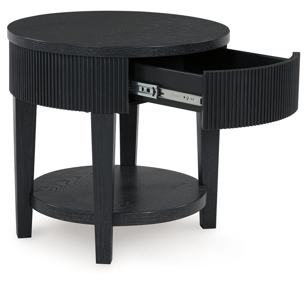 Classic and cool in dark charcoal, this end table brings contemporary convenience to your living room. Short on storage? The trendy reeded apron conceals a drawer perfect for remotes, controllers and other entertainment accessories. What a perfect marriage of style and functionality.