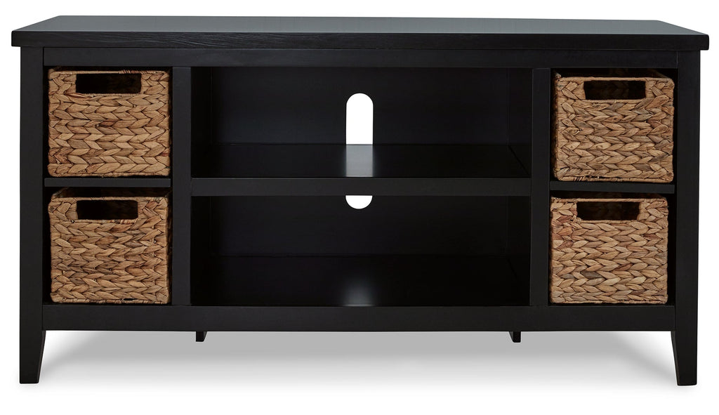 Bring the vintage casual vibe you love to the living room with this TV stand. A stylish storage solution in a black finish, this charming piece completes your entertainment area with ease. Open shelves and the included handwoven baskets provide an effortlessly beautiful look with endless possibilities.