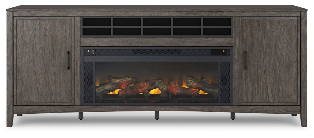 Bring a touch of warmth and beautiful ambiance to your living room. Cool and clean, yet warm and inviting. This TV stand with fireplace insert has so many standout qualities, making it an inspired choice for your dream decor. A prime example of “casual contemporary” style at its very best, the designer piece is dressed to impress in a medium gray-brown finish with a blackened wood grain contrast. Spacious cabinets and shelves are ideal for storing items like your e-reader, TV remotes and other entertainment must-haves. The decorative grille on the upper shelf can conceal a soundbar for a sleek look.