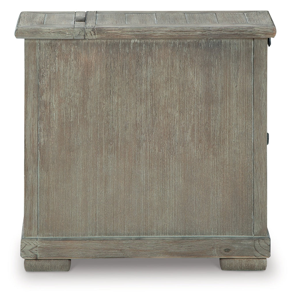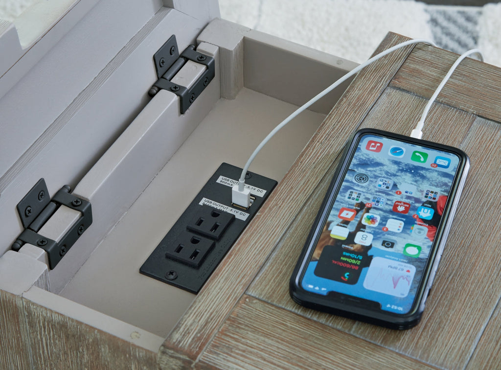 Lighten the look of your living space. This chairside end table offers a casual traditional aesthetic, with natural wood undertones enhanced by a glazed bisque finish and wire-brushed texture. The end table puts it all within reach, with a storage cabinet and pull-out tray. Its built-in power supply and dual USB ports have your charging needs under control.