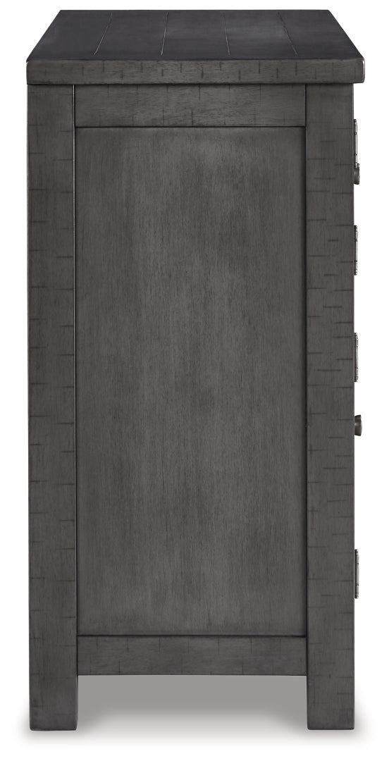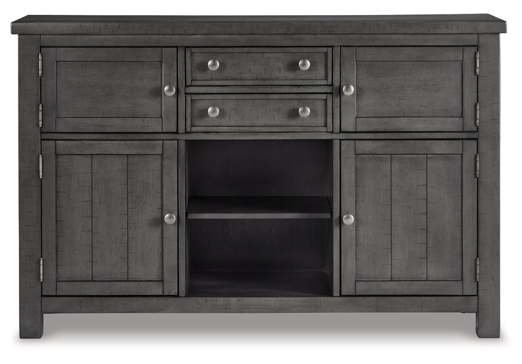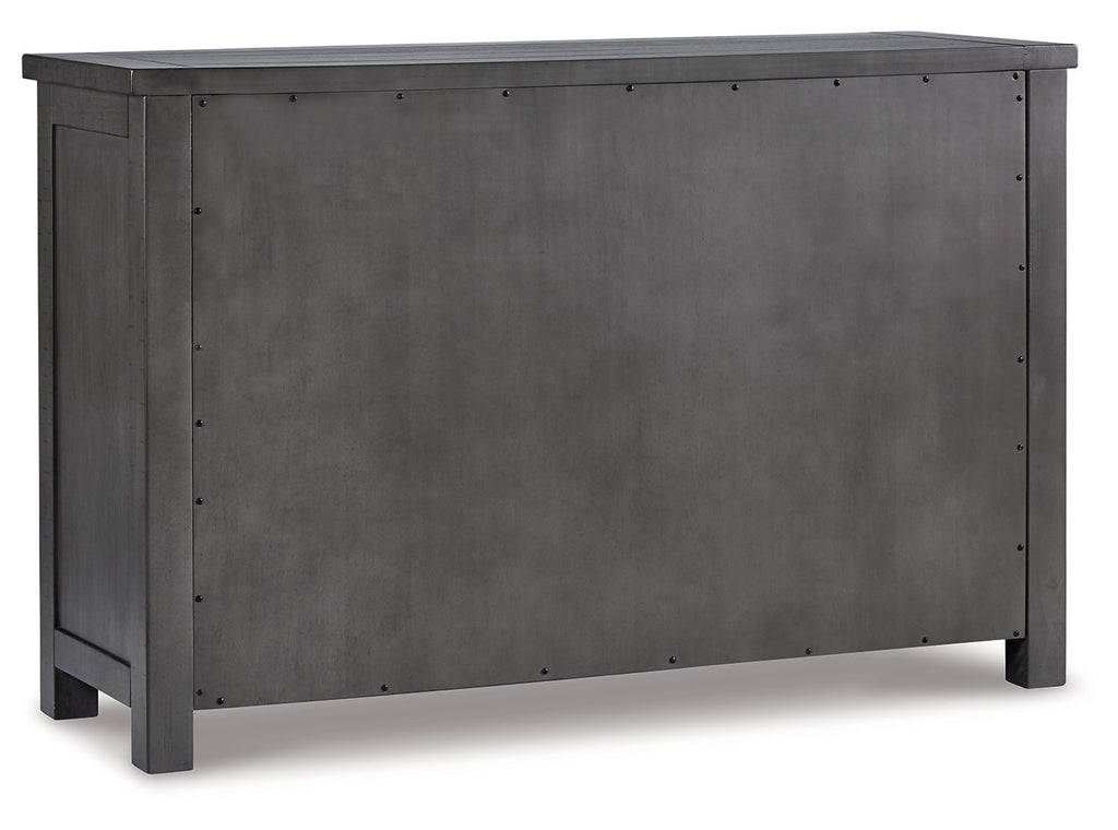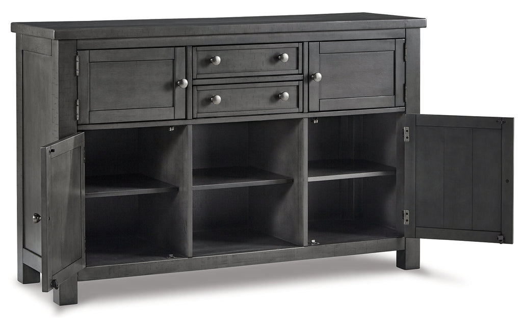 Going gray in the best possible way. This dining room server wows with an utterly on-trend smoky gray finish and plank styling. Crafted of acacia veneer and equipped with an abundance of serving and storage space, this server brings practicality and easy entertaining to your dining room. Just a touch of distressing helps it fit right in with your modern farmhouse decor.
