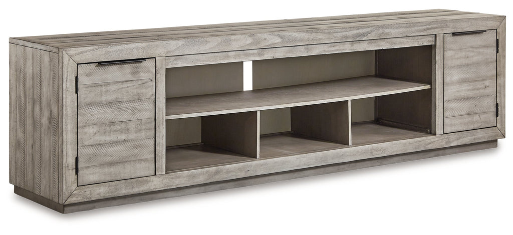 Balancing chic flair with a relaxed sensibility, this extra-large TV stand strikes just the right tone for rustic sophistication. Beautifully clean lines are subtly enhanced with relaxed distressing and saw marks for authentic barn wood character. You're sure to love the convenient open style for easy access to media equipment and accommodating pretty home accents.