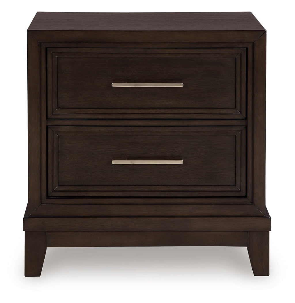 This nightstand combines modern and art deco styles for both traditional and contemporary arrangements. With elegant stepped moulded framing and two spacious drawers, it adds dimension to your sanctuary while keeping your belongings organized and clutter-free. Indulge in a fresh look that feels right at home.