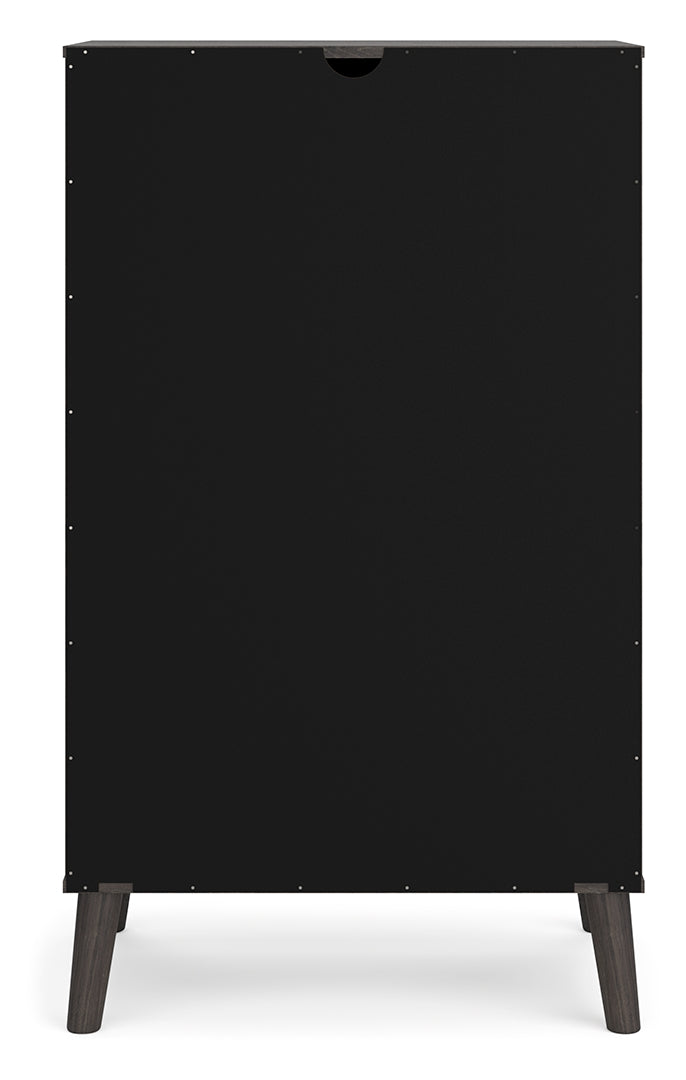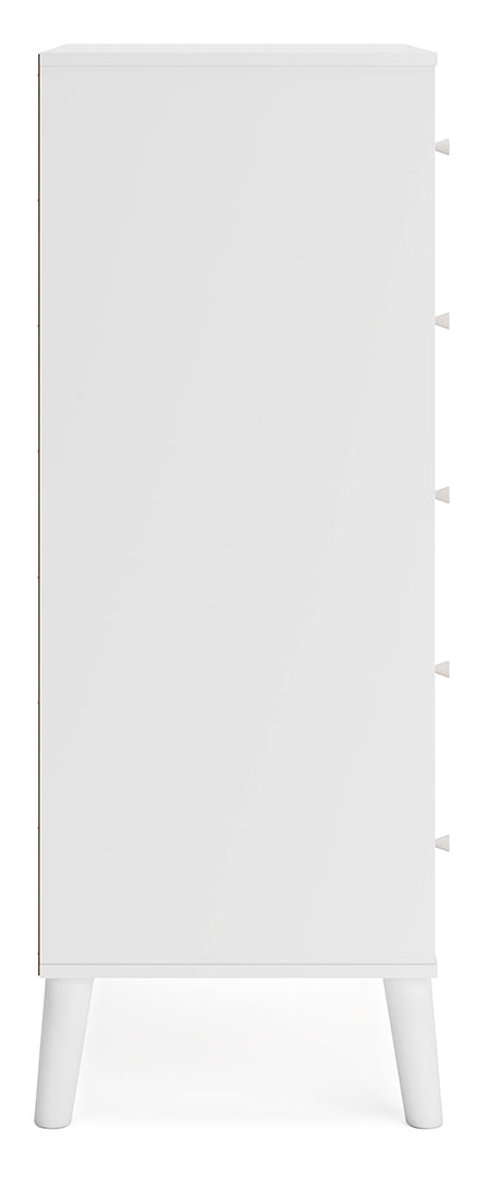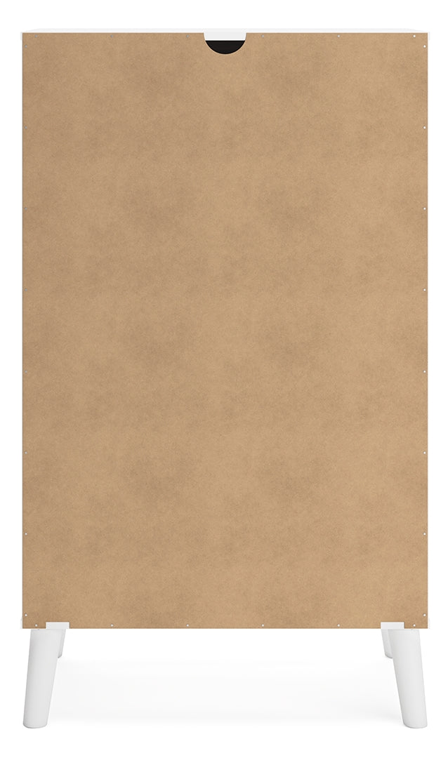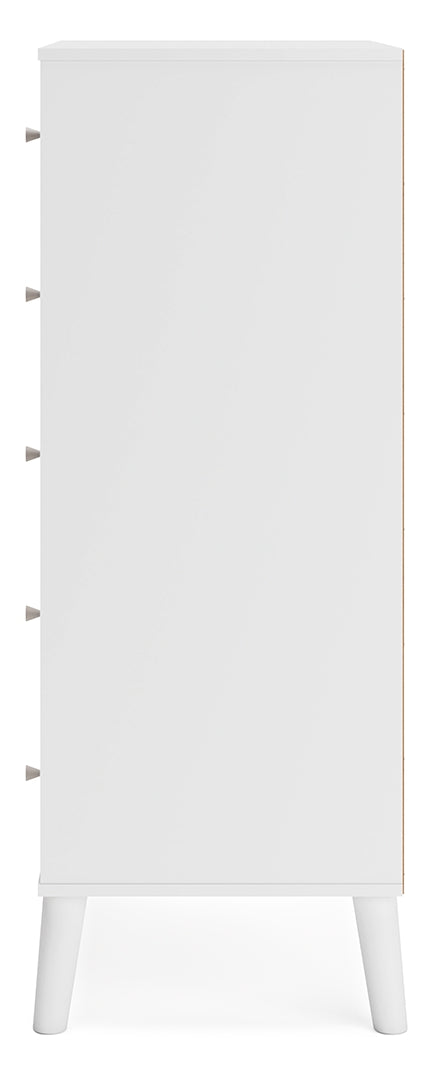 The perfect marriage of contemporary and casual style, this chest of drawers is a charming addition to your home. It's expressive with a two-tone look in a solid matte white finish and a replicated sugarberry wood grain pattern. Ball-bearing glides offer smooth opening and closing of the drawers, while white knobs and splay legs add a finishing touch.