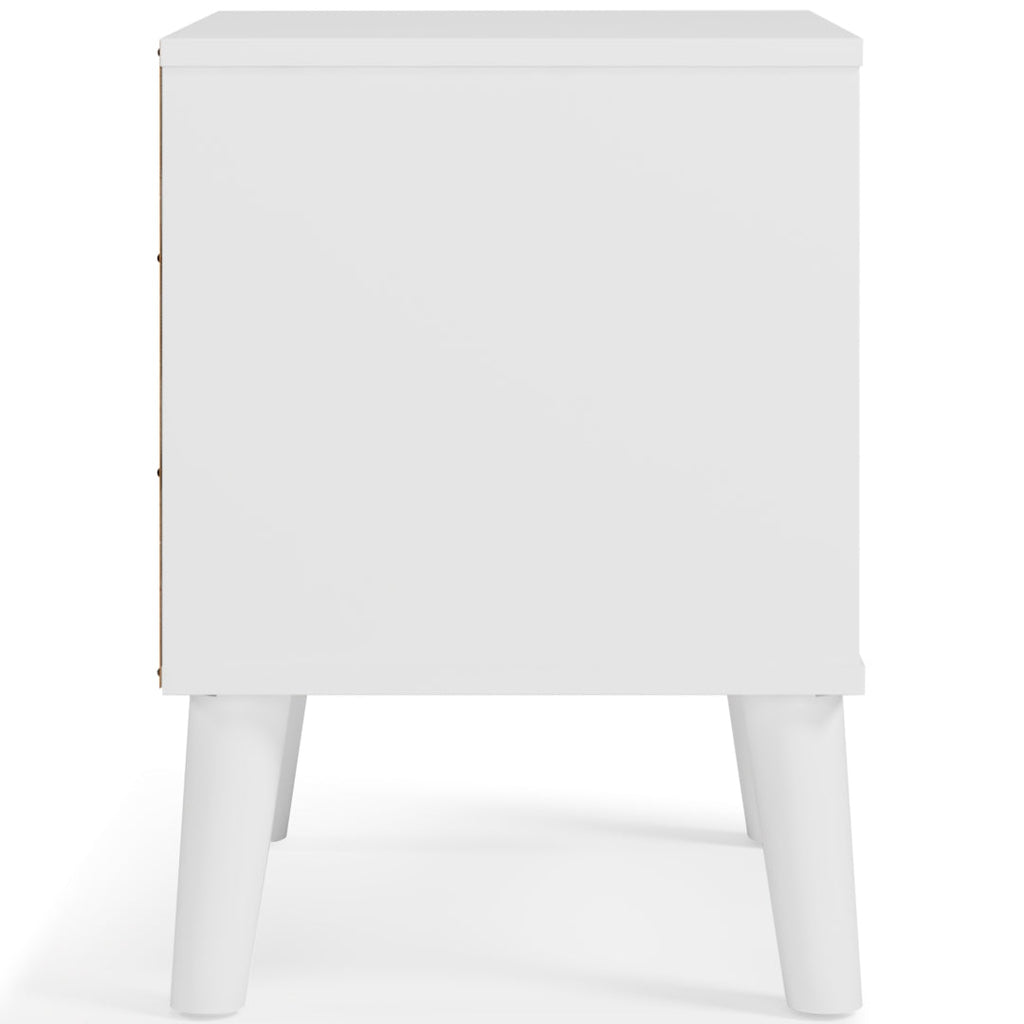 The perfect marriage of contemporary and casual style, this nightstand is a charming addition to your home. It's expressive with a two-tone look in a solid matte white finish and a replicated sugarberry wood grain pattern. White knobs and splay legs add a finishing touch, while the open shelving allows for extra storage.
