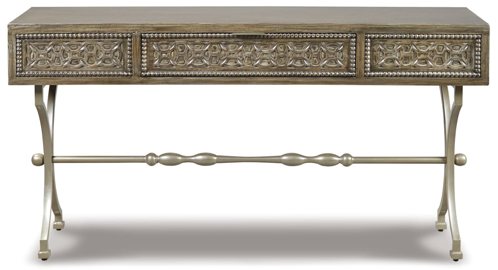 This console sofa table is style with a purpose. This casual look flaunts a medallion pattern along the front. Champagne color finished metal complements the antiqued gray finished wood. Show off decor on top. Rest assured X-base is as strong as it looks. Functional drawer allows you to keep knickknacks out of sight.