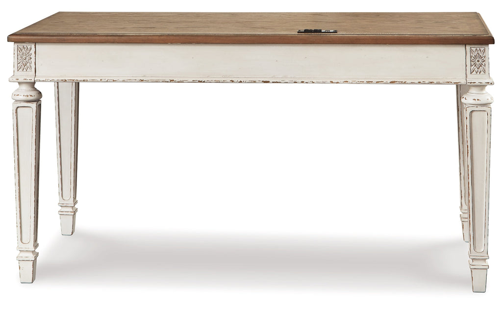 Elevating the art of traditional cottage styling, this designer desk is your heavenly home office realized. Antiqued two-tone aesthetic blends a chipped white with a distressed wood tone top for added charm. Framed drawer fronts, decorative corbels and elegantly turned and tapered legs add refinement, while dark bronze-tone knobs lend a classic touch.