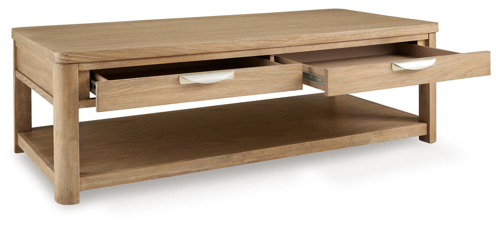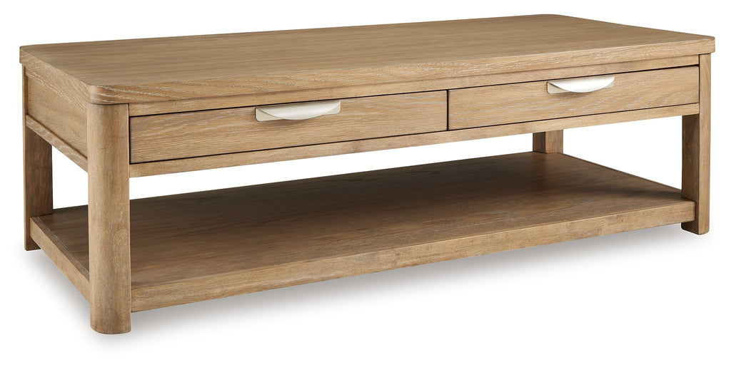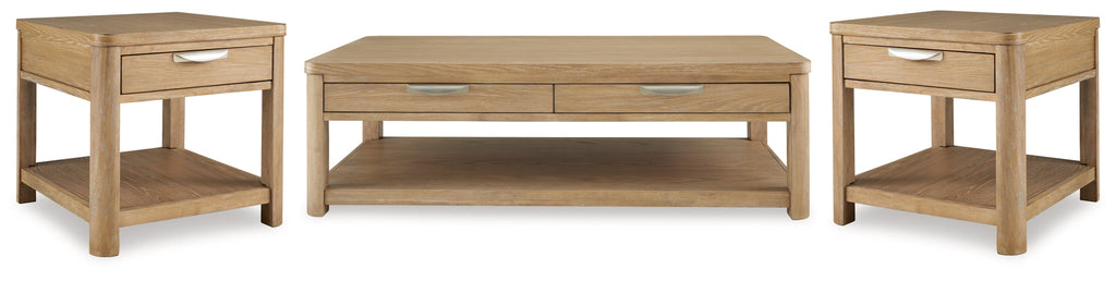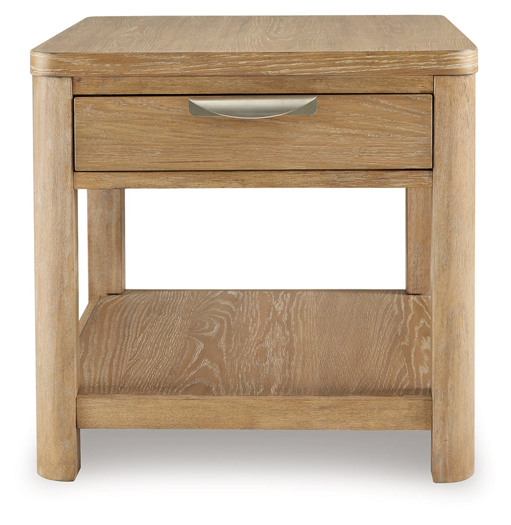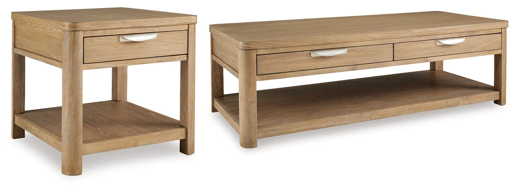 The classic yet contemporary good looks of this occasional table package are hard to deny. Softly shaped posts with a light oak finish and wire-brushed wood grain texture lend an organic appeal to your soothing space. Roomy drawers cater to additional storage needs while keeping clutter at bay.