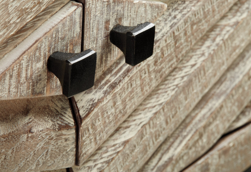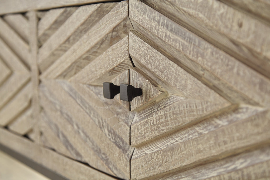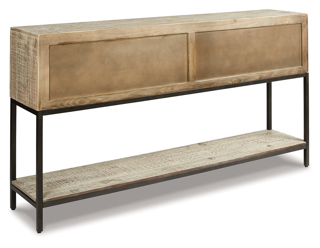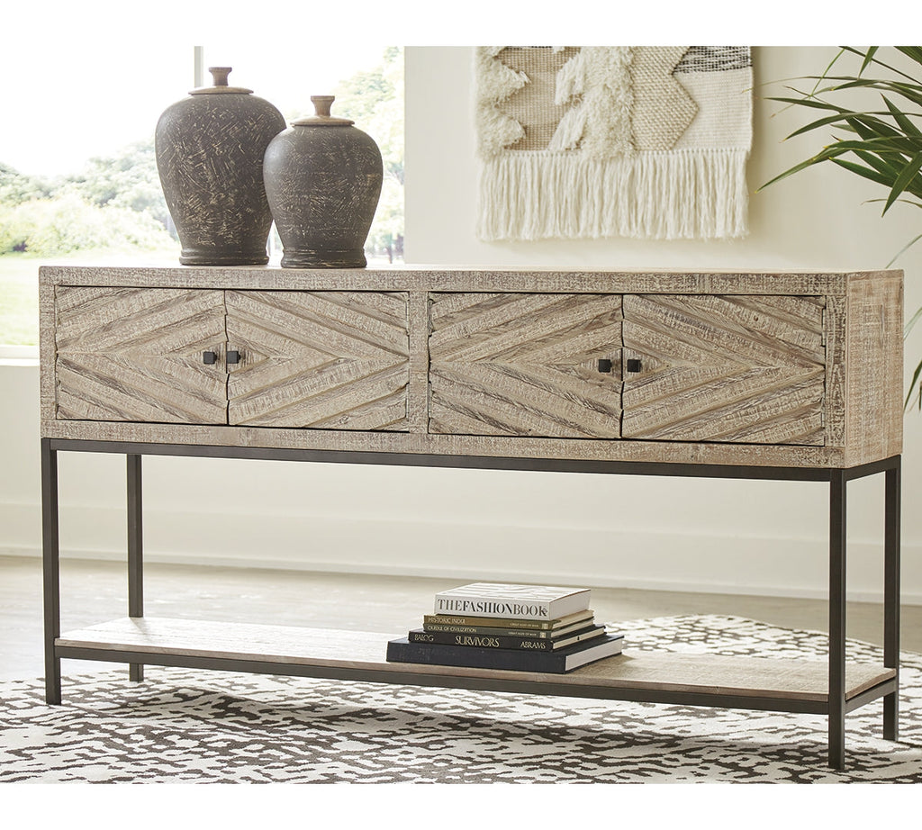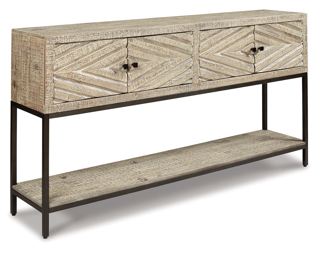 Make a cool, contemporary statement with this console sofa table. Sporting diamond-carved cabinet door fronts with great dimension, this designer piece is an inspired choice for an entryway, dining room or living space. Combination of distressed white wood and black metal is so striking.