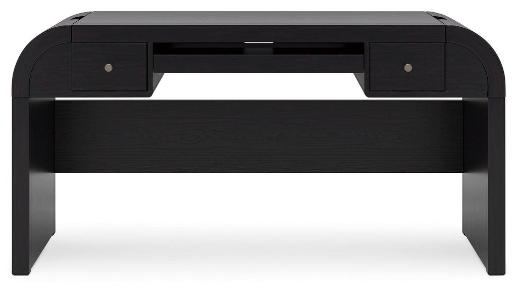 Inspired by art deco design, this softly shaped home office desk makes a lasting impression in a simply stunning way. Its magnificent curved silhouette is enhanced by a rich layered black finish on the textured wood grain surface. Complete with ample storage, a pull-out keyboard tray and USB charging, this is the all-in-one piece you’ve been looking for to elevate your contemporary workspace decor.