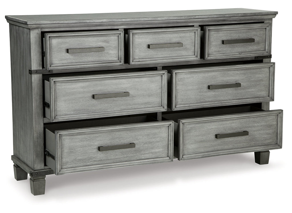What's old is what's new with this dresser. Serving up a fresh look in urban farmhouse style, this eclectic piece features a light weathered gray finish with dark aged bronze-tone accents and metal straps for a casually cool sensibility. Profiled drawer frames, thick-profiled top moulding and tapered legs are the earmarks of timeless design.