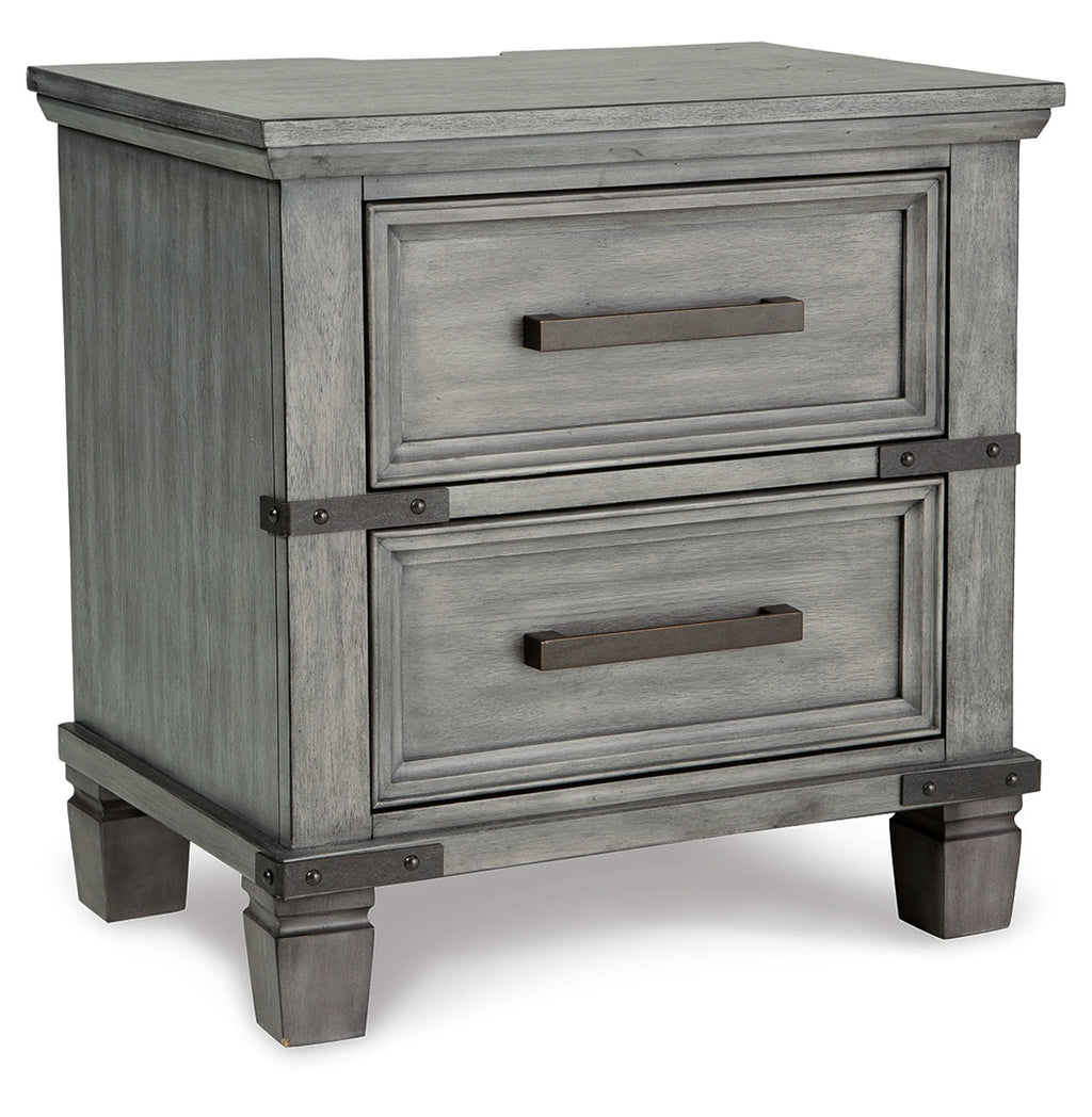 What's old is what's new with this nightstand. Serving up a fresh look in urban farmhouse style, this eclectic piece features a light weathered gray finish with dark aged bronze-tone bar pulls and metal straps for a casually cool sensibility. Profiled drawer frames, thick-profiled top moulding and tapered legs are the earmarks of timeless design.