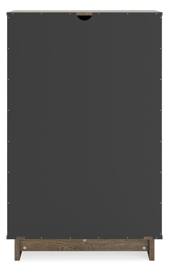 Your modern sanctuary is within reach. The subtle design of this chest is accented with a low profile base. Its weathered brown finish is complemented with refined champagne-colored handles on the five smooth-gliding drawers.