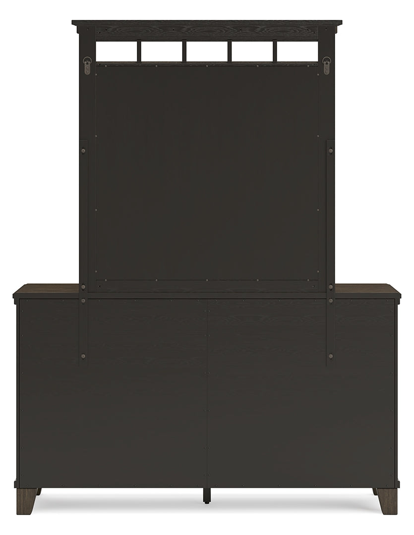 This dresser with mirror is well-suited to everyday living with its expertly balanced approach to style and function. Take the stress out of decorating—a classic medium brown finish easily pairs with existing furniture pieces. Its timeless design stays in style as you update your space, while open detailing at the top of the mirror is a trendy touch. All that's left for you to do is to effortlessly enjoy the day-to-day comforts of home.