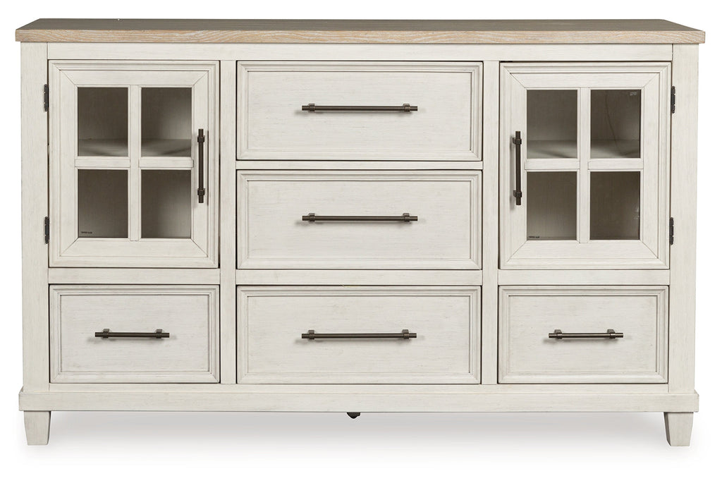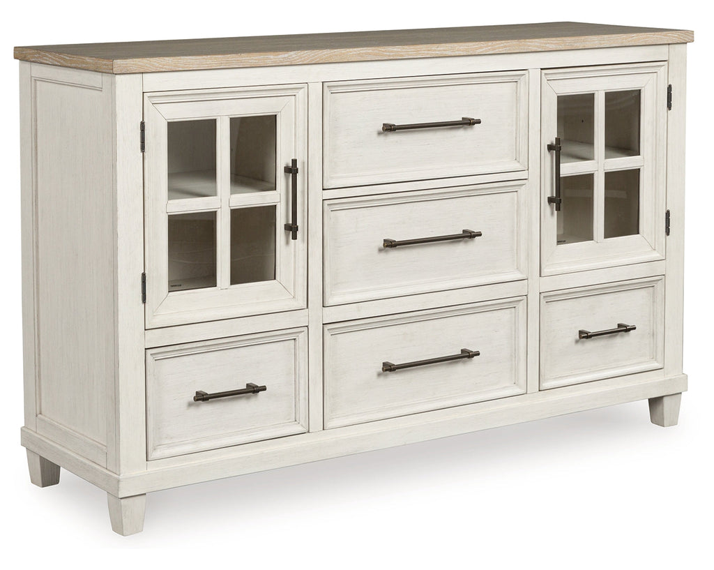 This dresser elevates the art of modern farmhouse design. Its two-tone aesthetic blends antiqued white and light grayish brown for a charming finish. Framed drawer fronts and windowpane cabinets lend a country feel. Conveying a feeling of relaxed comfort, the dresser is sure to carry you away to a dreamy time and place.