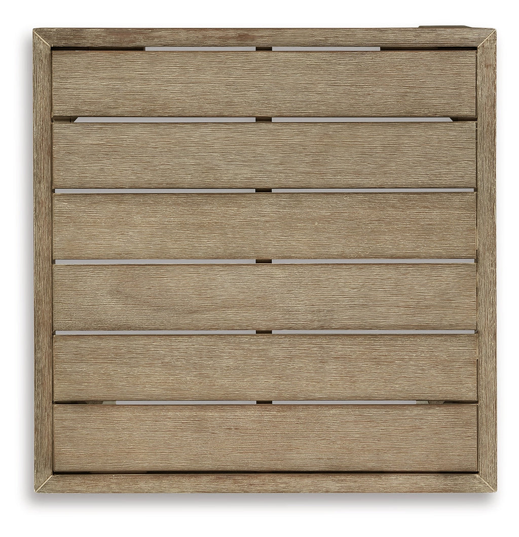 Beautifully on point, this outdoor end table is the natural choice for modern minimalists who know that less is more. Quality crafted of eucalyptus wood, this ultra clean-lined outdoor table is enriched with a multi-step embossed finish that both brings out the wood’s natural grain and protects it from the elements for seasons of fun in the sun. Incorporating form and function, the plank top naturally sheds rainwater.