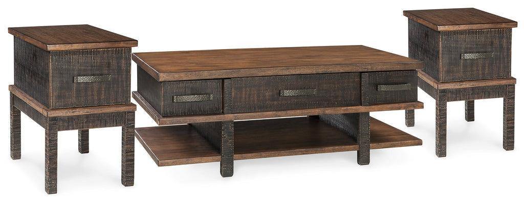 Earthy, rustic character. Clean, contemporary lines. The best of both stack up beautifully in this occasional table package. Simple, blocky profiles are enriched with a two-tone finish with deep distressing for a decidedly different aesthetic. And with subtly placed USB ports on the end table, this set is high design meets high tech.