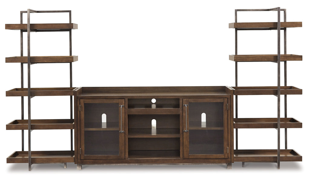 For fans of urban industrial design, this 3-piece entertainment center clearly steals the show. Its blend of acacia veneer and wood is beautified with an oiled walnut-tone finish for a highly contemporary aesthetic with grainy, earthy character. Infusion of dark bronze-tone metal takes the cool character to another level. While the look might be richly substantial, open-concept piers and glass-front cabinets lighten the mood. And for your added viewing pleasure, this entertainment center is compatible with our electric fireplace inserts (sold separately).