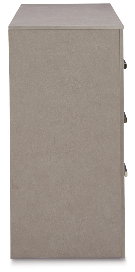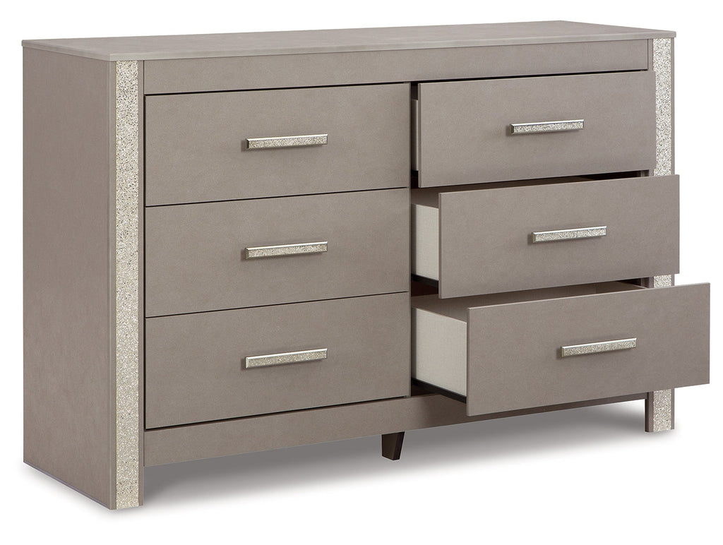Love sleek and bold contemporary style? Drink in the beauty of this dresser. Its eye-catching details include glam glitter accents and the look of leather grain with a subtle gray finish. Large-scale linear handles, in a sophisticated champagne chrome tone, play perfectly with the streamlined aesthetic. This storage piece is a simply stunning way to achieve the bedroom of your dreams.