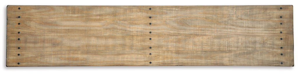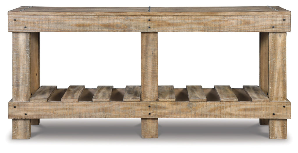 As this console table proves, sometimes less is more. Dramatically transform your living space with the warm and rustic appeal of solid wood construction and open-slat shelving. Washed in a light brown finish, this sofa table sets a new standard for down-to-earth refinement.