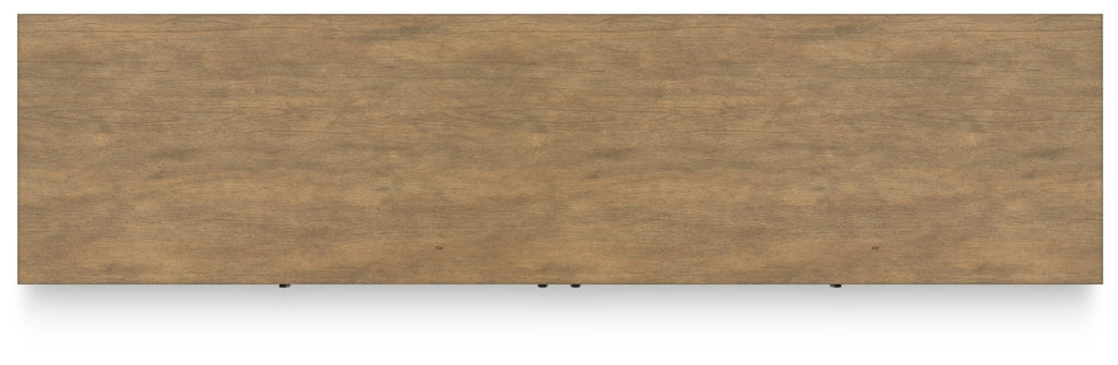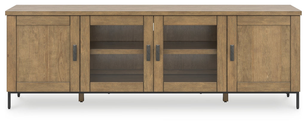Made for the everyday, this TV stand is a sleek complement to your casual contemporary living room. You’ll love the refined-yet-relaxed vibe of its contrasting medium brown finish and matte black legs. Concealed and glass-front cabinets make media storage a breeze. And for added function, cord management holes throughout the piece make connections easier.