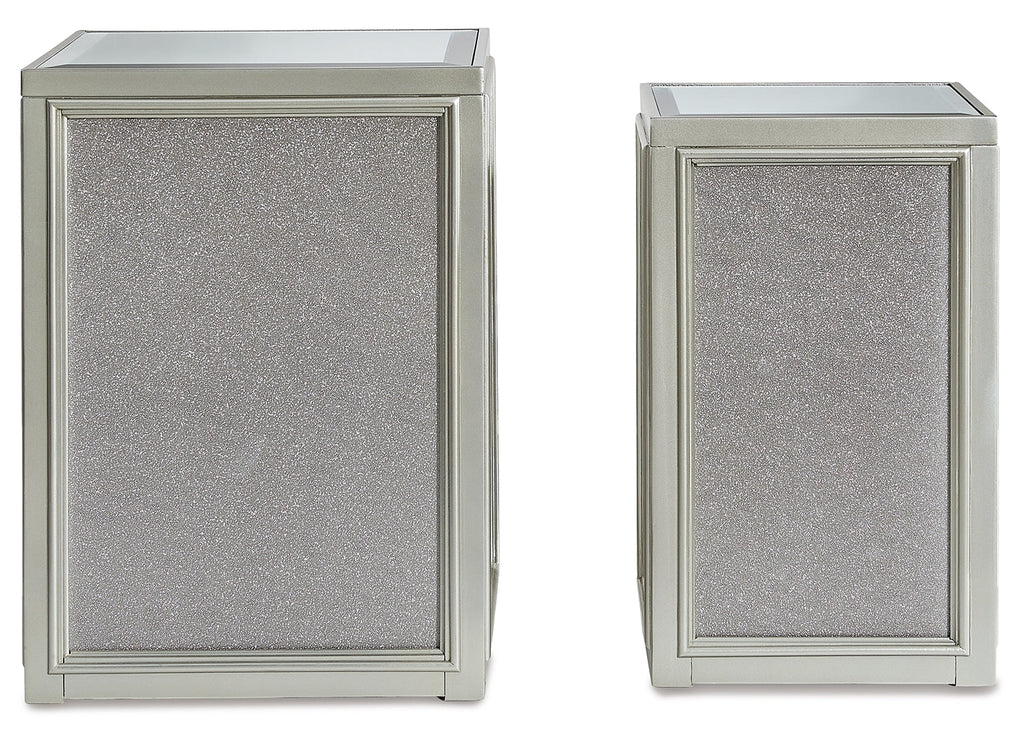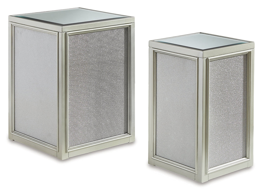 Reminiscent of Hollywood glamour of yesteryear, this set of nesting end tables interprets luxury in a decidedly modern way. A dazzling metallic silvertone finish and textured laminate panels for added luster enhance the star power, while the beveled inset mirrored tabletop brings that touch of glam you've been yearning for.