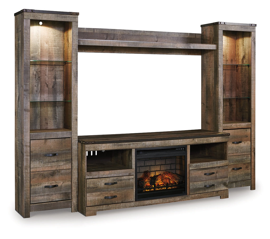 Entertain a rugged yet refined sense of style with this 4-piece entertainment center. Its rustic finish and plank-style details pay homage to reclaimed barn wood, while metal banding with nailhead accents infuses a touch of industrial cool. Ultra-clean lines ensure a look that can go from the country to the city and feel equally at home.