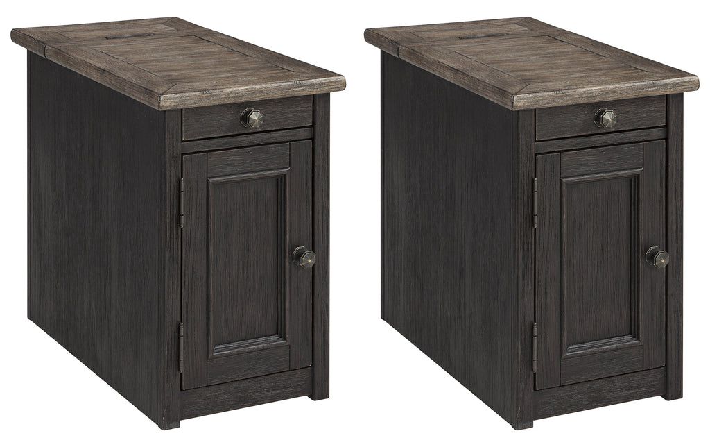 Shabby chic with a hint of down home country. This 2-piece chairside end table set with textured black finish is all the talk of today’s design world. Wood grain shows through the weathered gray-brown top in all of its earthy pleasure. Pull-out tray with lovely traditional hardware has two cup holders. Fuel up your devices with the convenient charging station.