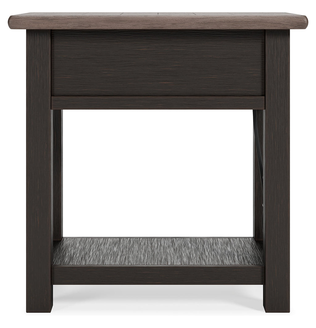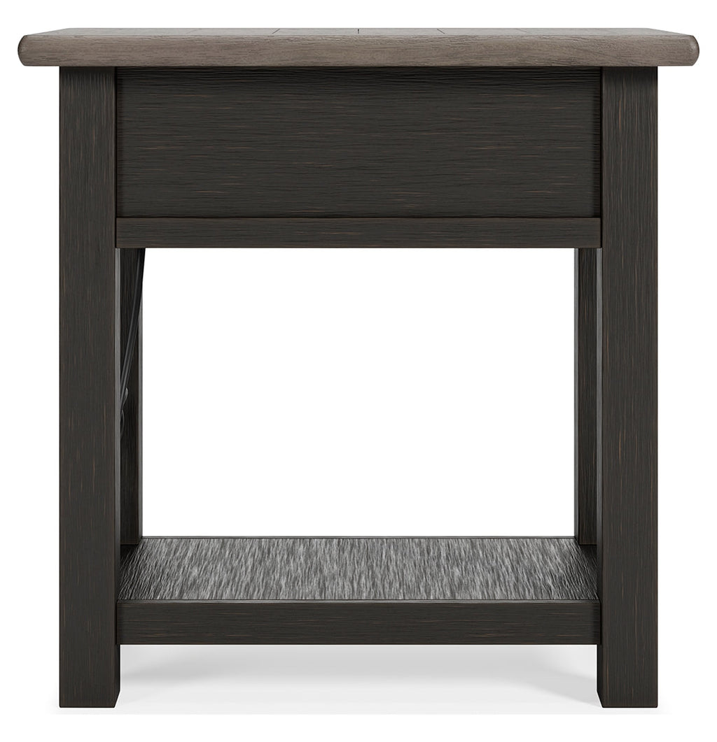 Quality crafted and richly styled, this rectangular chairside end table is sure to charm. Its two-tone aesthetic pairs a weathered grayish brown tabletop with a textured wire brushed base in black. A built-in shelf offers handy display space. And the table's integrated 110V power supply and dual USB charging ports make it so easy to keep your personal devices powered up.