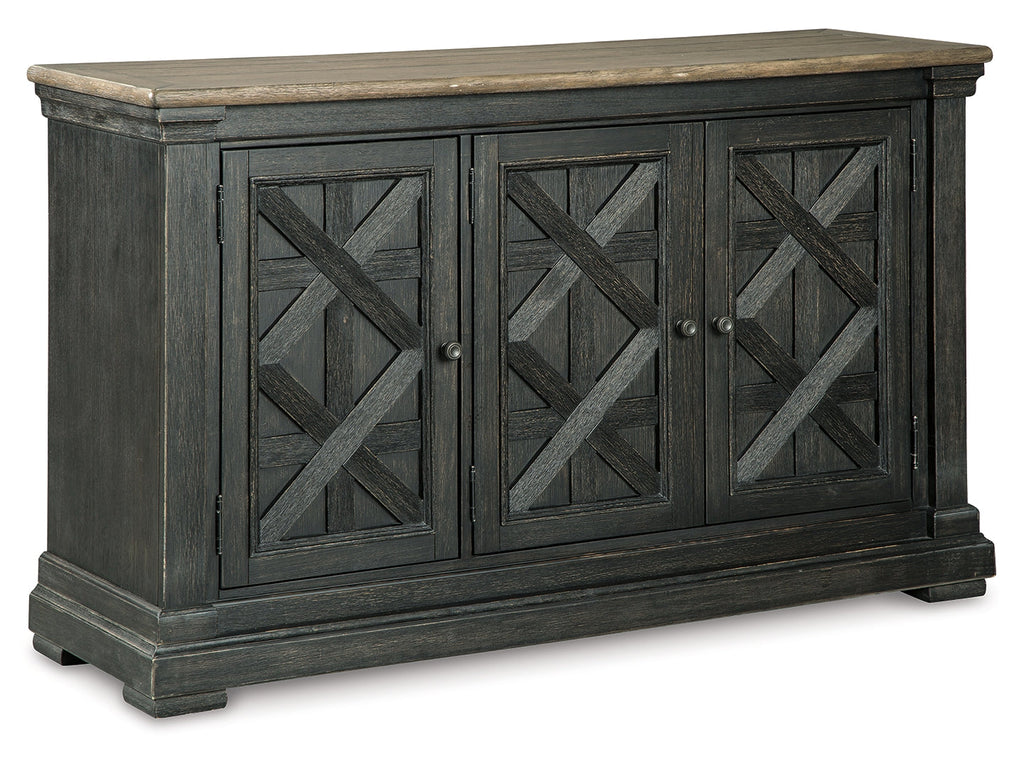 Invite your family into the heart of your home with this dining room server. Black finish is beautifully textured. Timeworn planked oak top creates a unique two-tone contrast. Charming lattice design graces the front of the doors. Store away essentials on the cabinet shelving. Thick pilasters add to the sturdiness of the foundation. This is trend-right urban farmhouse style.