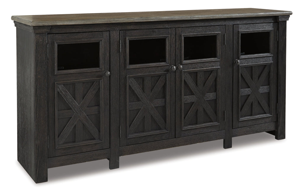 Shabby chic with a hint of down-home country, this TV stand appeals to today’s more relaxed sensibilities. Its richly rustic two-tone effect blends a textured black finish with a weathered gray-brown top for an easy-elegant aesthetic. Framed doors with crossbuck detailing and clear glass insets bring a touch of modern farmhouse to the scene.