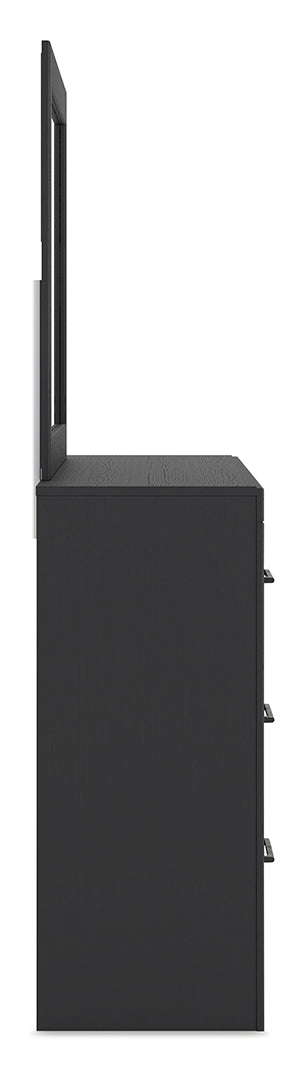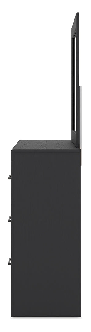 Relaxed yet striking, this dresser and mirror set brings casual beauty and function to your dream destination. The dresser's delightful two-tone treatment blends a fresh replicated walnut grain with a matte black finish. You'll look fabulous in the unadorned simplicity of the mirror, which lends a contemporary touch while you dress for work or play.