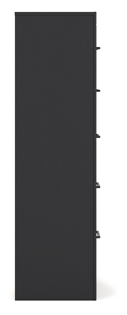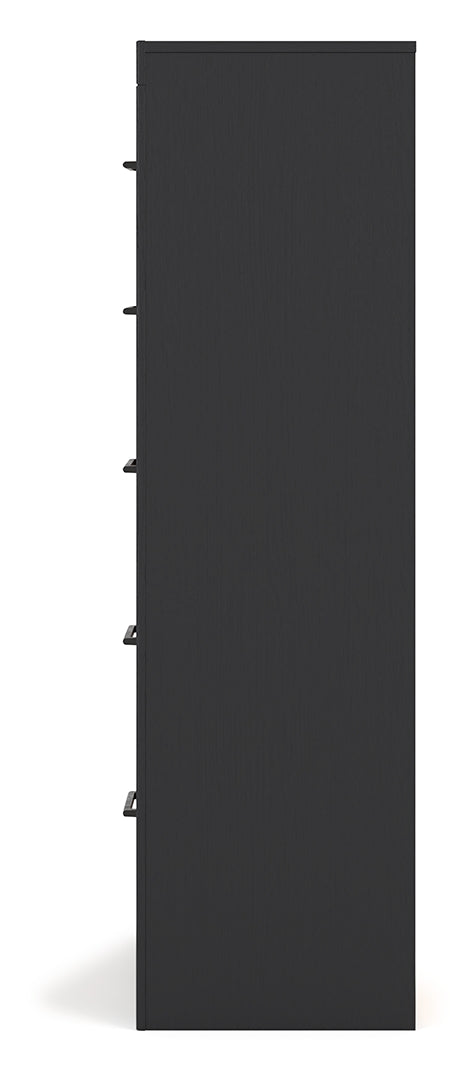 Relaxed yet striking, this chest of drawers brings casual beauty and function to your dream destination. You're sure to love its spacious drawers that glide open and offer plenty of storage for your wardrobe and spare bed linens. A delightful two-tone treatment blends a fresh replicated walnut grain with a matte black finish, while sleek handles in an antiqued gunmetal finish lend a contemporary touch.
