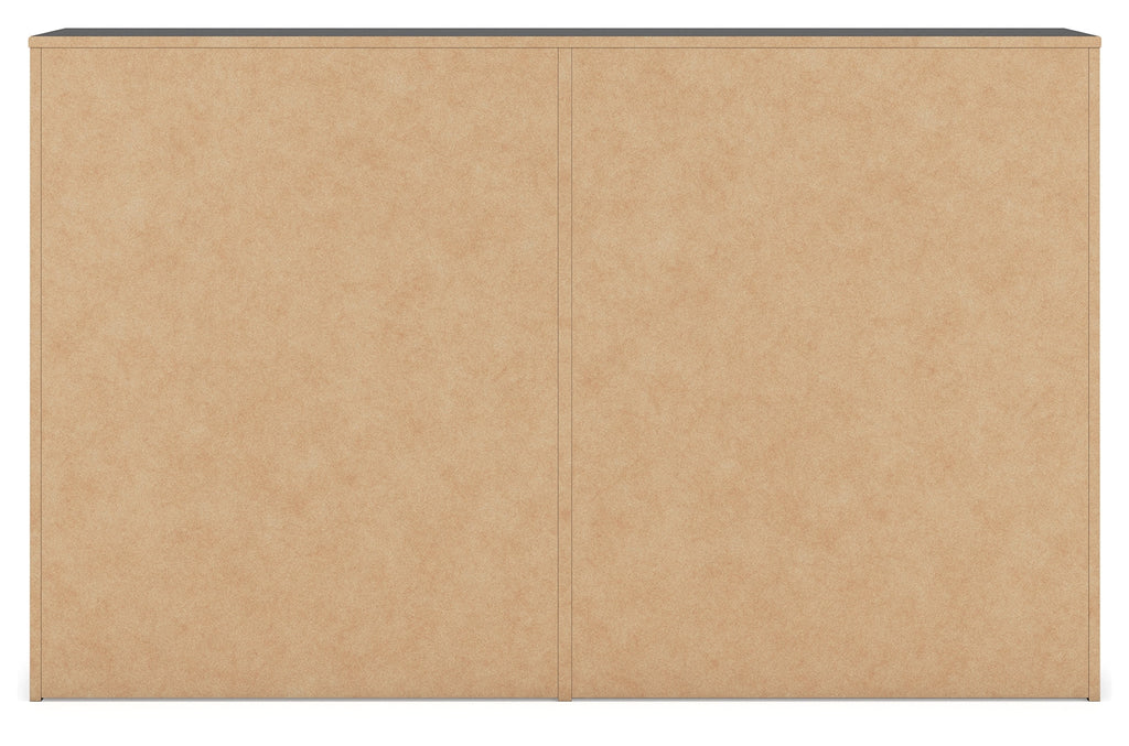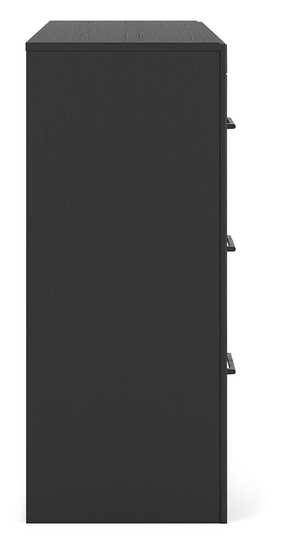 Relaxed yet striking, this dresser brings casual beauty and function to your dream destination. You're sure to love its spacious drawers that glide open and offer plenty of storage for your wardrobe and spare bed linens. A delightful two-tone treatment blends a fresh replicated walnut grain with a matte black finish, while sleek handles in an antiqued gunmetal finish lend a contemporary touch.
