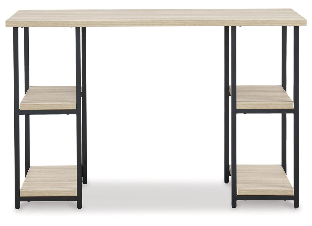 Contemporary meets casual for the ultimate office space. This desk aims to please with its durable melamine top and metal base in a powder coated finish. The top features a replicated exotic wood grain in a light tan finish, while the double-shelf pedestal design makes this versatile piece perfect for your workspace. DURA TUFF™ surfaces are made of easy-clean melamine which is heat-, scratch- and water-resistant.