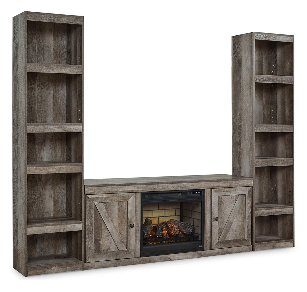 This entertainment center with electric fireplace is sure to win your heart with its fresh take on country living. Its crisp, clean and minimalist-chic profile is enriched with a gray finish, striking replicated oak grain and thick plank styling for that much more authentic character. Crossbuck detailing adds a brilliant barn door-inspired touch. There's ample storage room, as well as plenty of open shelf space to showcase home accents, safely out of the way. What really turns up the heat: an electric infrared fireplace insert with faux firebrick surround that operates with or without infrared heat. With the touch of a button, adjust the temperature and the flame brightness, and set the timer for long-lasting enjoyment.